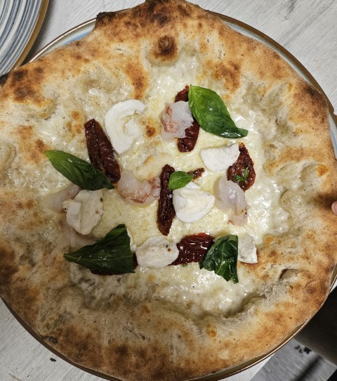 Bianca, mozzarella, bufala campana, pomodori secchi, code di gambero argentine, basilico fresco