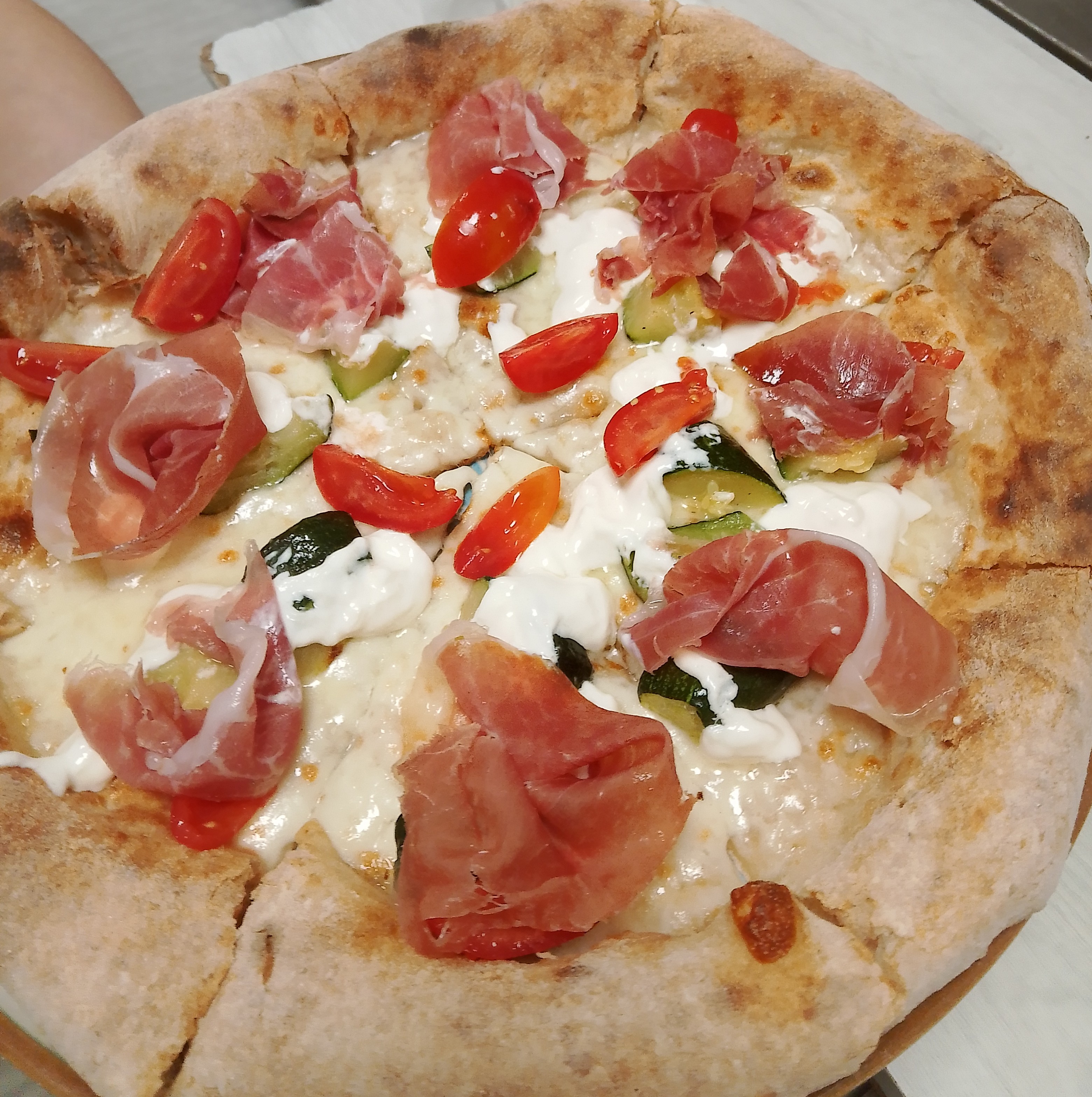 Bianca, mozzarella, bufala campana, zucchine, pomodori datterino, carpaccio di tonno