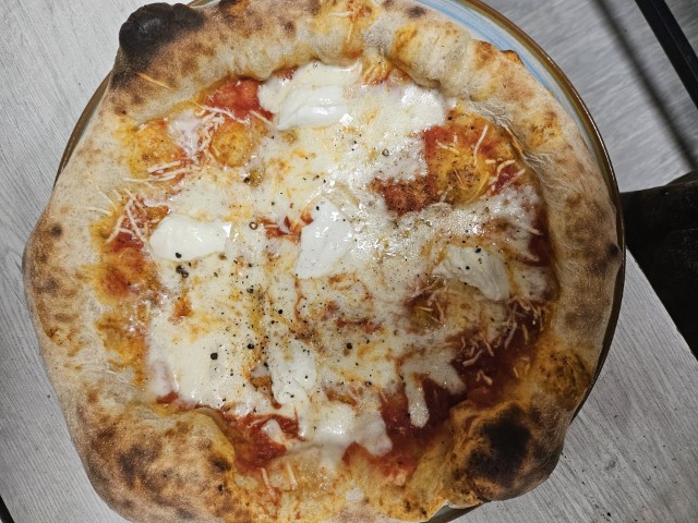 Bianca, mozzarella, bufala campana, scaglie di pecorino, pepe macinato